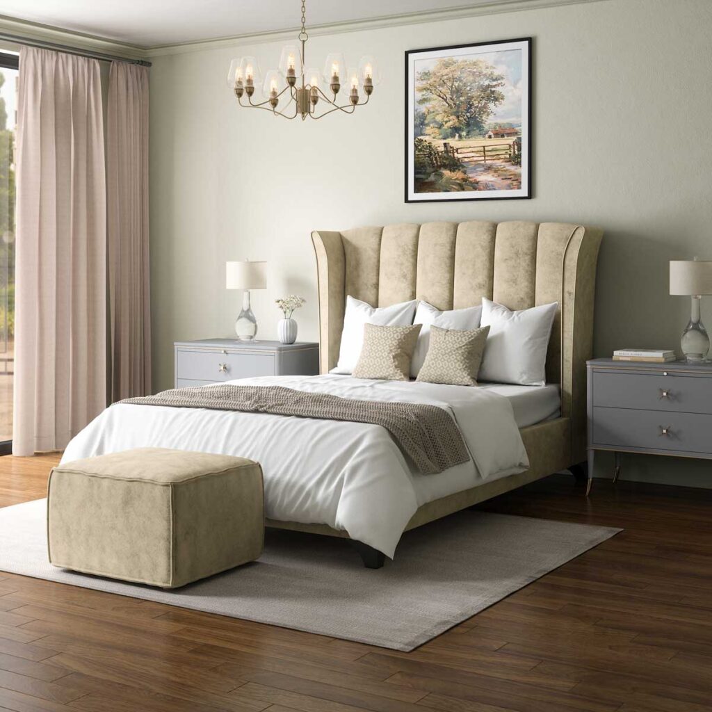 Crafted with meticulous attention to detail, the Avery features a gracefully curved wingback headboard adorned with vertical panelling, exuding sophistication and timeless appeal.