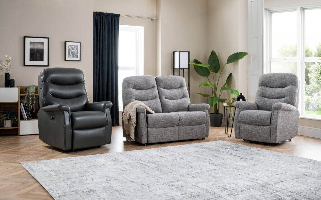 The Hollingwell range offers a stylish look, with a high back and softer arm detail for extra comfort. Along with innovative powered headrest and lumbar support options for all 3 chair sizes and powered settees.