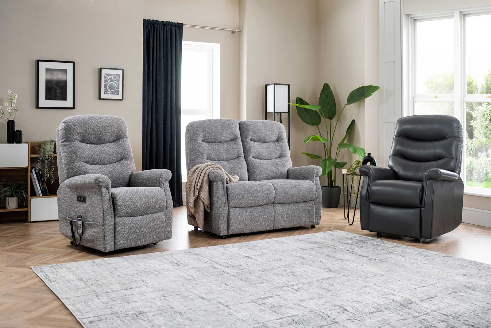 The Hollingwell range offers a stylish look, with a high back and softer arm detail for extra comfort. Along with innovative powered headrest and lumbar support options for all 3 chair sizes and powered settees.