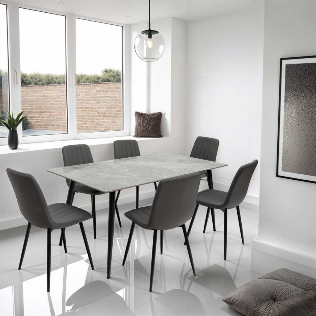 Available as Shore 4 or Shore 6, a choice of 4 or 6 Grey chairs with Snow White or Italy Grey Tables